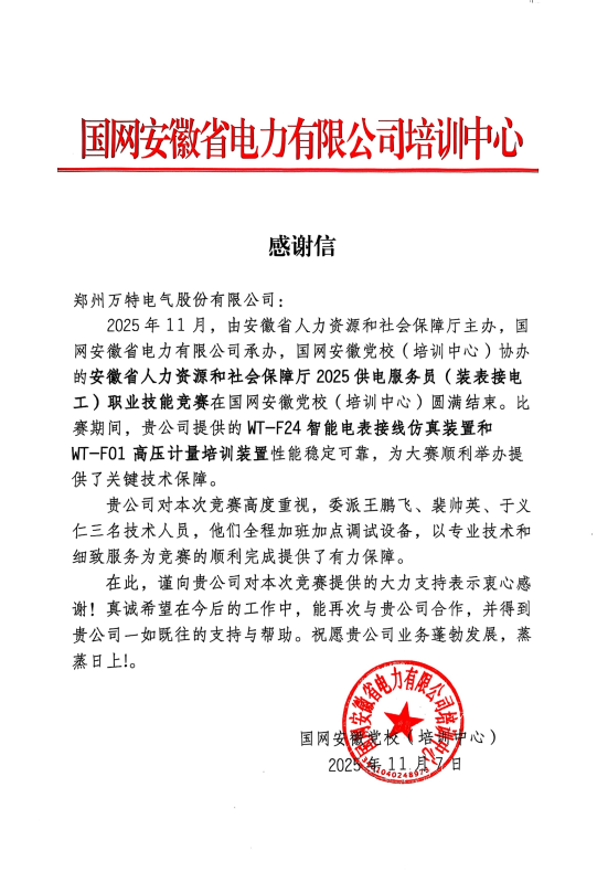 “比賽期間,貴公司提供的WT-F24智能電表接線仿真裝置和WT-F01高壓計(jì)量培訓(xùn)裝置性能穩(wěn)定可靠,為大賽順利舉辦提供了關(guān)鍵技術(shù)保障。